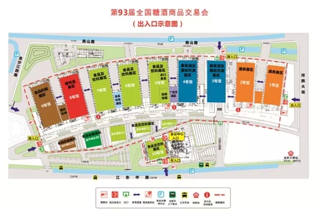 本届糖酒会共设展商及观众主要出入口4处。分别是位于江东中路金陵会议中心多功能厅(10号馆)东侧的东入口,位于金沙江西路国博9号馆南侧的南入口,位于燕山路国博3号馆下穿路西侧的西入口和位于河西大街南京国博1号馆北侧的北入口。